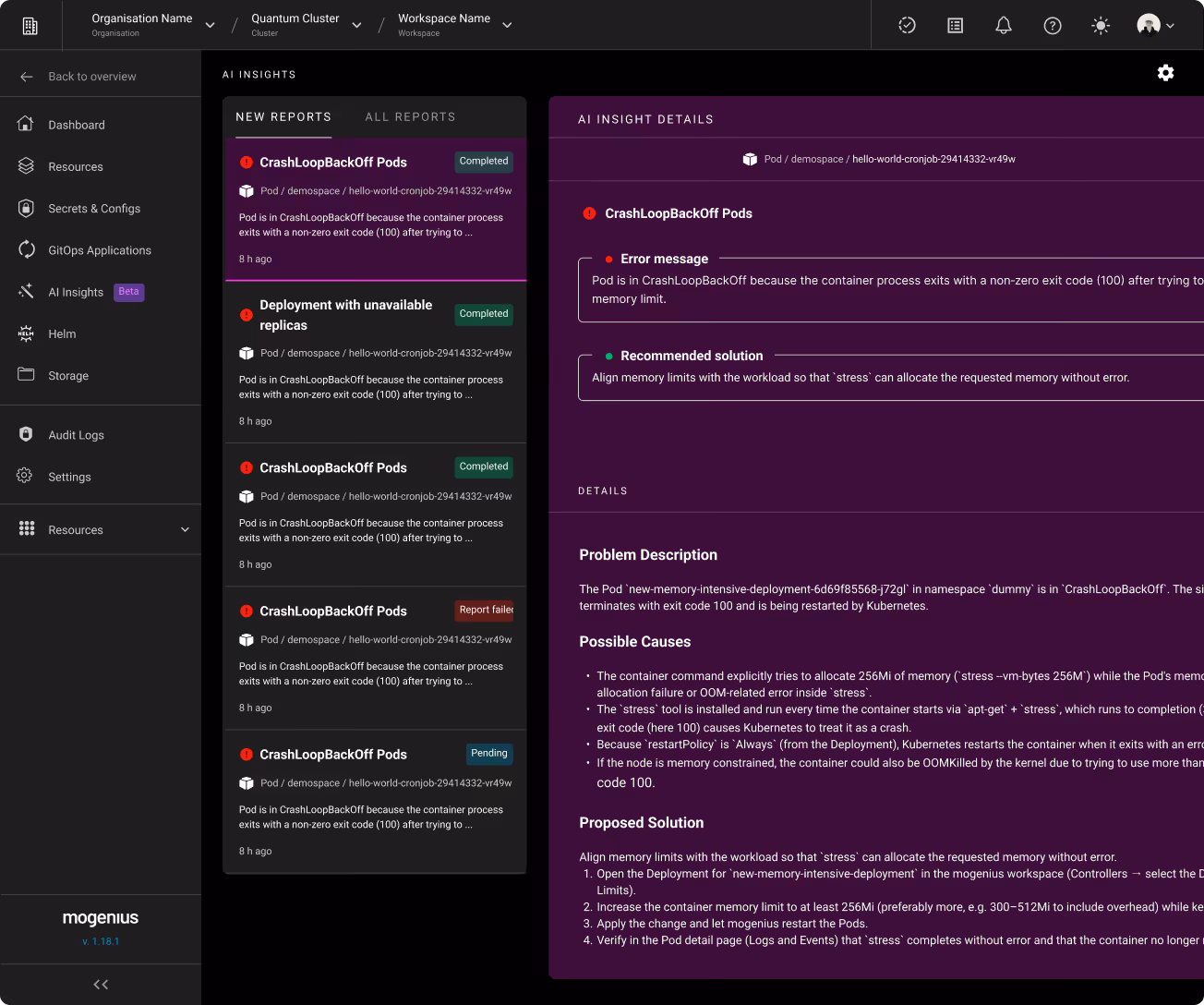 Most teams already have kubectl, metrics dashboards, logs, and Git history. What they lack is a shared, accessible understanding of how failures unfold across time and systems. AI Insights introduces a consolidated, context-aware analysis layer built on data collected by the mogenius operator. The goal is simple: reduce dependency on Kubernetes experts without reducing control.