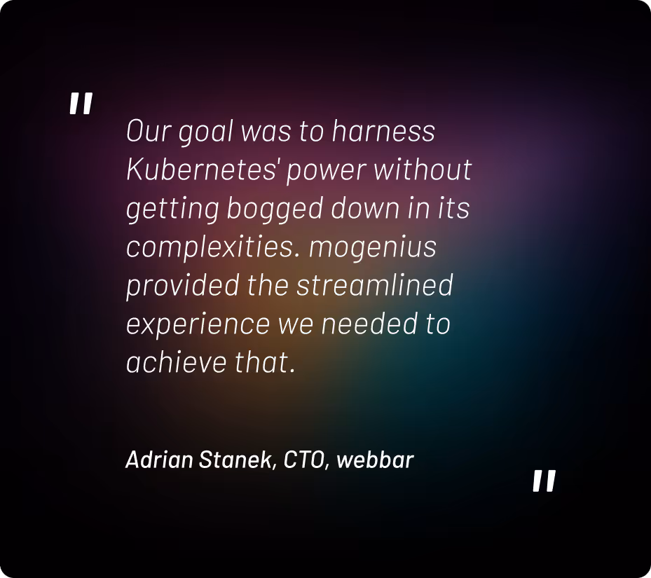 mogenius provided a solution that addressed webbar's skills shortage and non-functional requirements. mogenius delivered the internal developer platform (IDP) layer, allowing webbar to adopt a robust Kubernetes foundation without the inherent architectural and maintenance toil. The professional services team acted as the client’s extended platform team, accelerating the adoption of best practices.