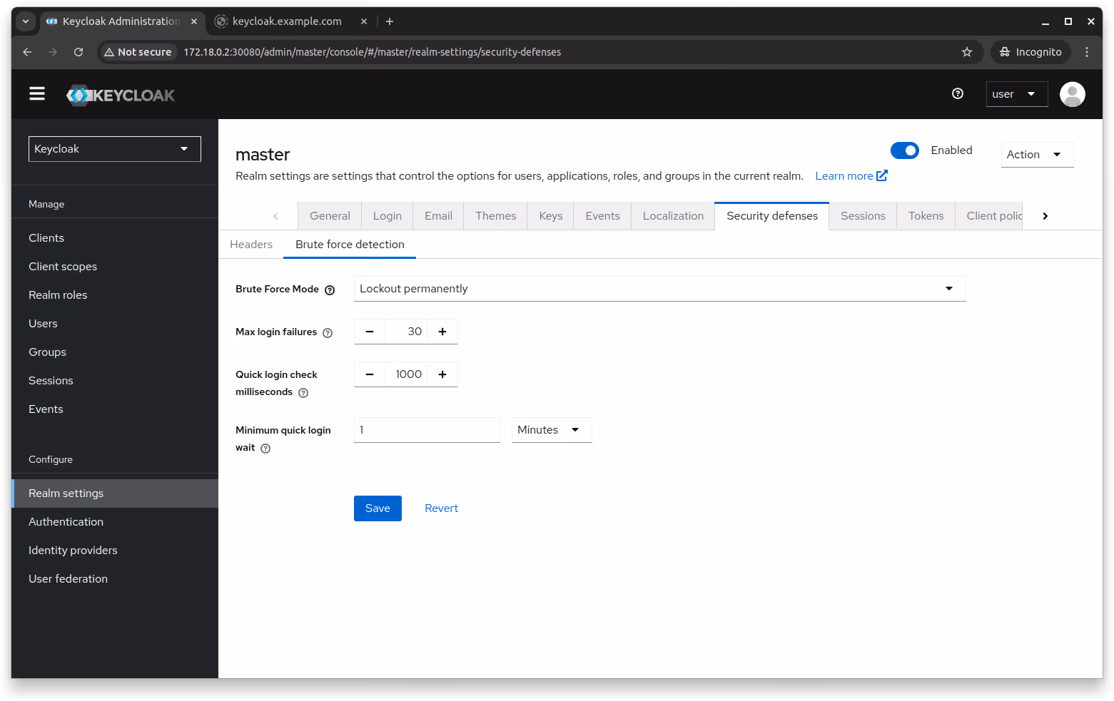 When you're logged in to the master realm as the admin user, you can set up some initial security measures from the GUI interface. These settings will apply to all other realms and their identities.
