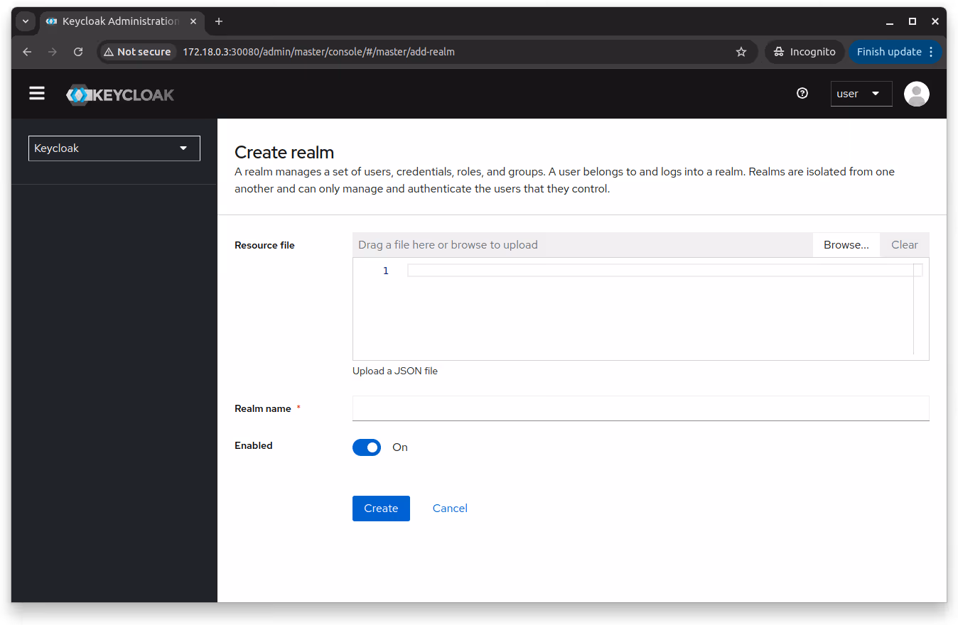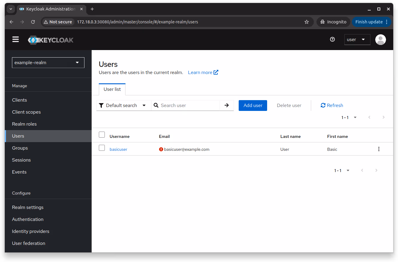 For example, if you update the keycloakConfigCli section of your values.yaml with the following code, it will create the "example-realm" alongside a user called "basicuser" and a group named "basicgroup" inside that realm:
