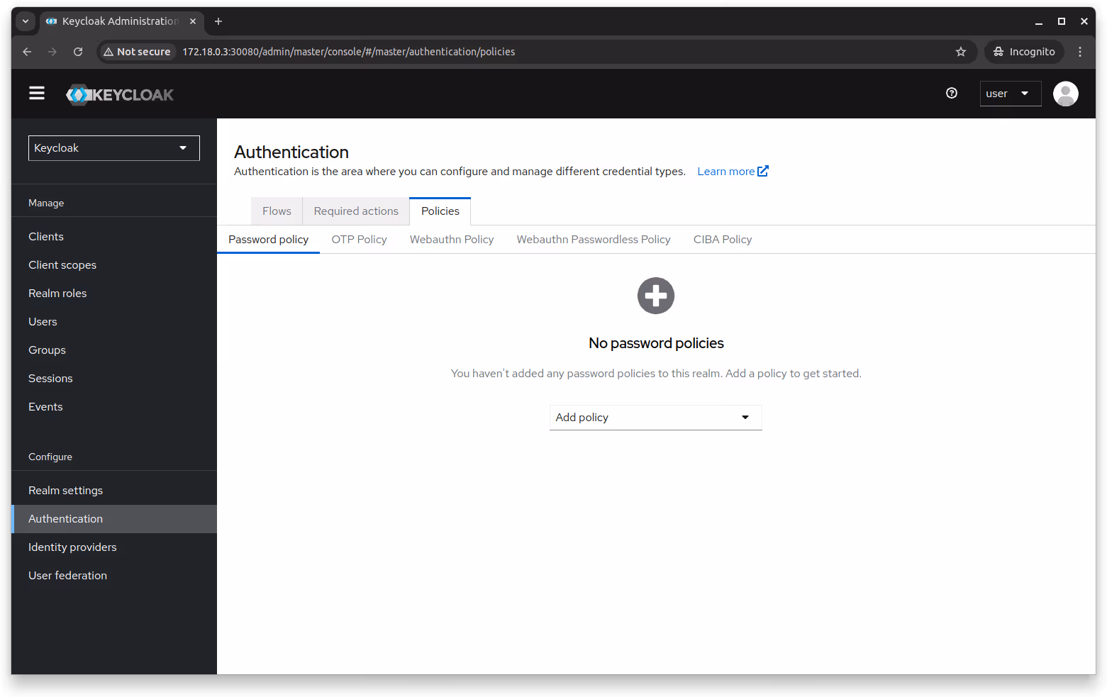 Use the URL provided in the output to access the Keycloak admin panel. The default admin username is user. To retrieve the autogenerated password from the main Keycloak pod, use the command below, which spawns a shell inside the main pod and locates the admin password using grep: