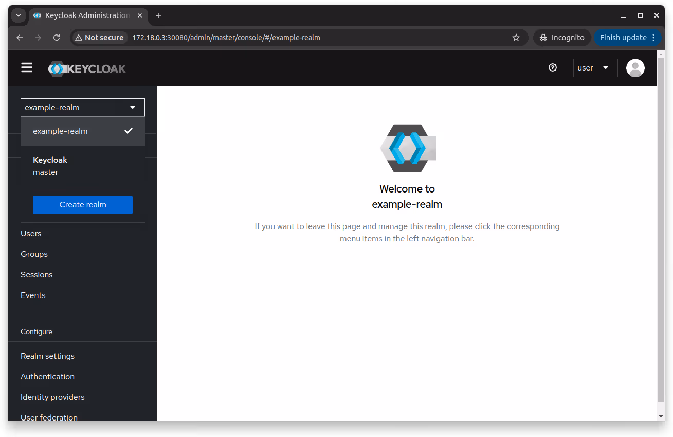 If you log in to the Keycloak admin console again and navigate to the realm dropdown at the top left, you'll see the newly created example-realm.